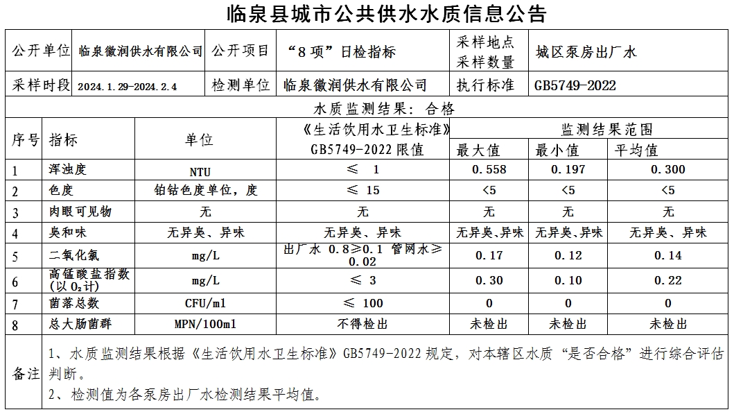 上一条: 临泉县城市公共供水水质信息公告2024年2月5日至2024年2月11日(8项)