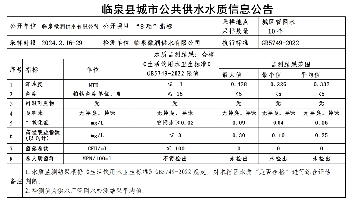下一条: 临泉县城市公共供水水质信息公告2024年2月19日至2024年2月25日(9项)