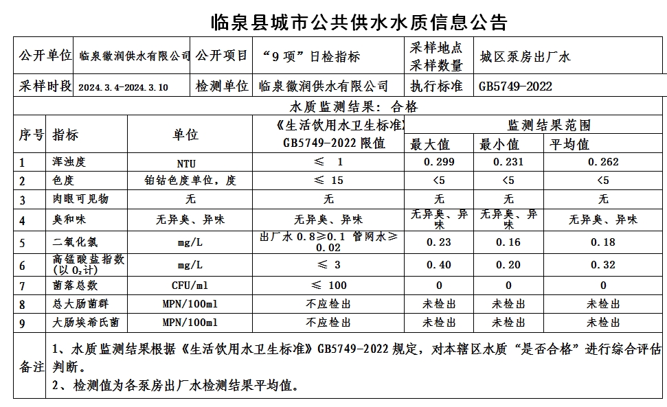 上一条: 临泉县城市公共供水水质信息公告2024年3月11日至2024年3月17日(9项)
