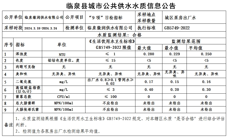 上一条: 临泉县城市公共供水水质信息公告2024年3月25日至2024年3月31日(9项)