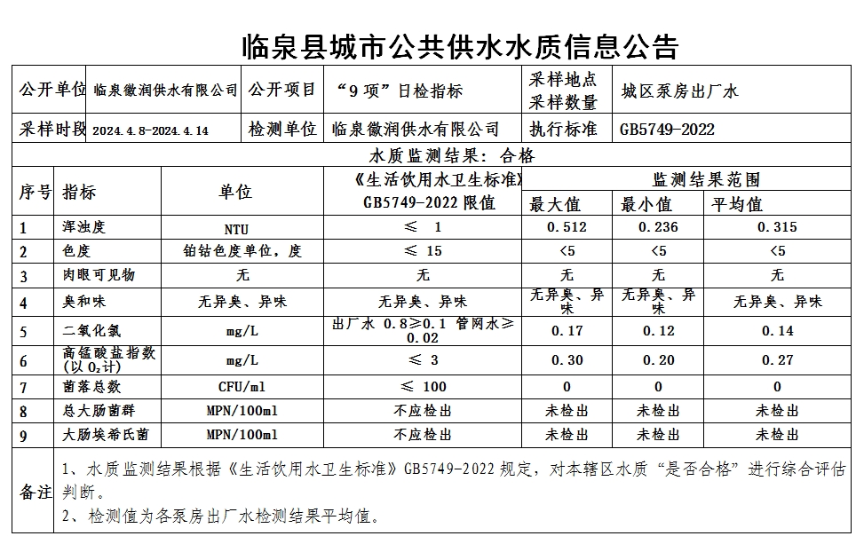 下一条: 临泉县城市公共供水水质信息公告2024年4月1日至2024年4月7日(9项)