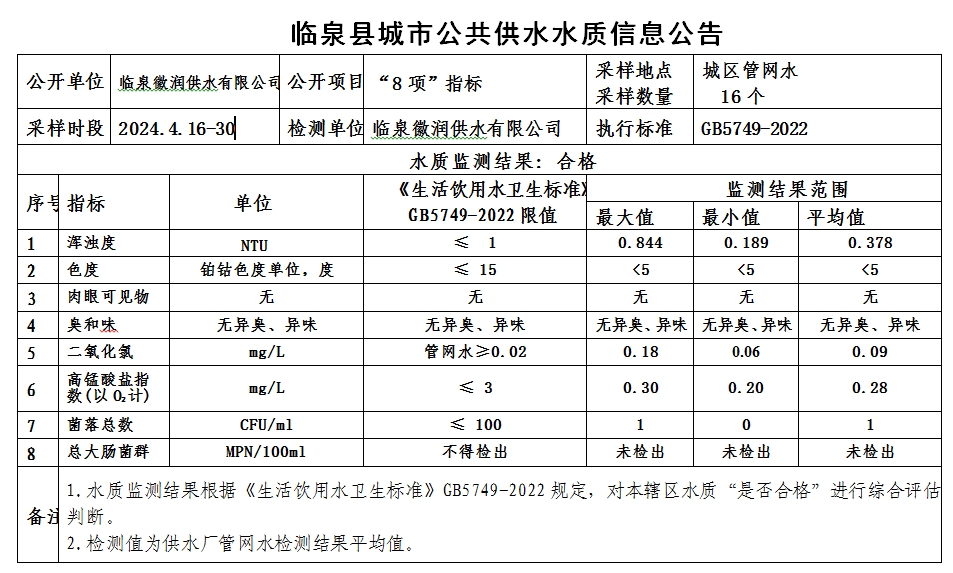 下一条: 临泉县城市公共供水水质信息公告2024年4月22日至2024年4月28日(9项)