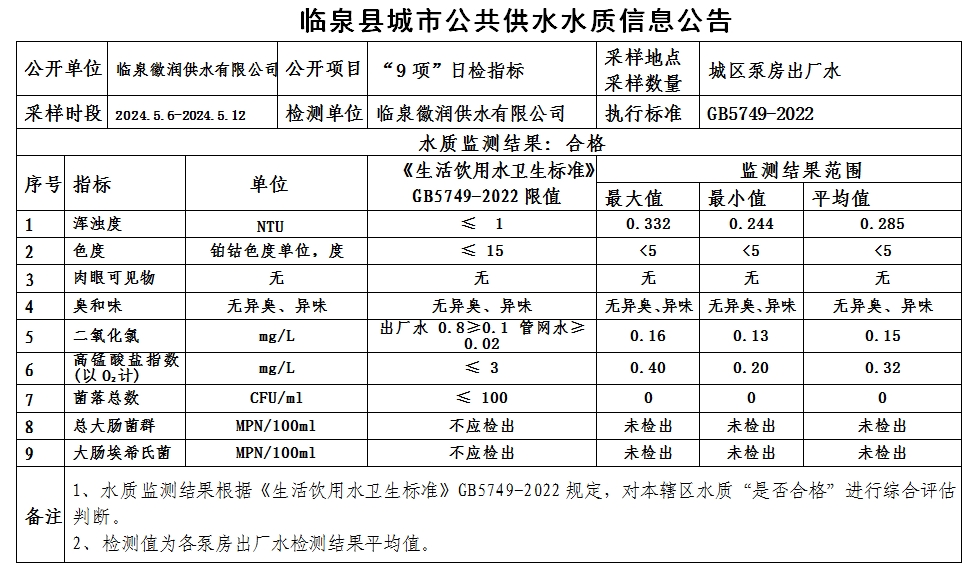 上一条: 临泉县城市公共供水水质信息公告2024年5月上半月(8项)