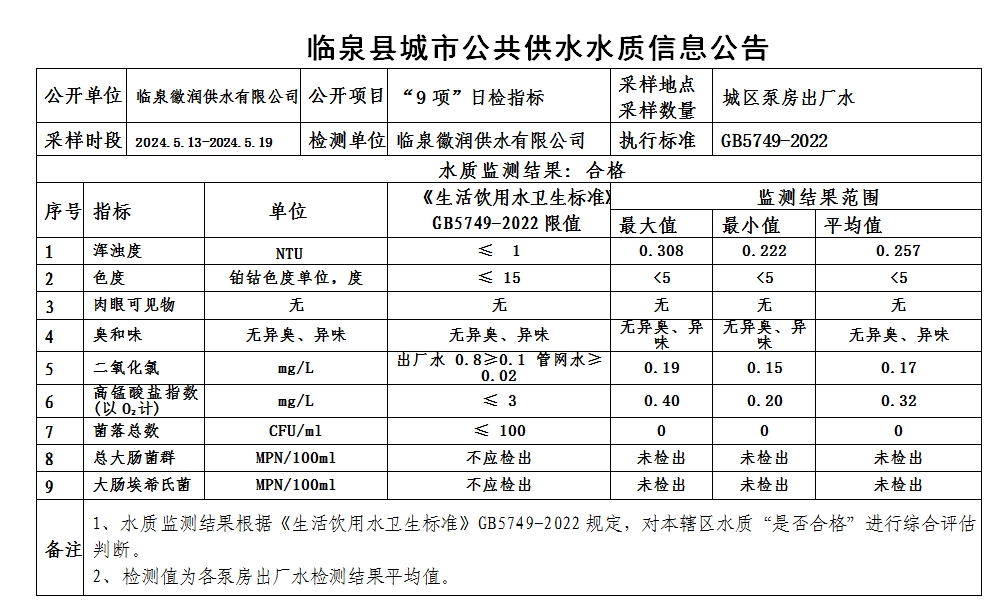 下一条: 临泉县城市公共供水水质信息公告2024年5月上半月(8项)
