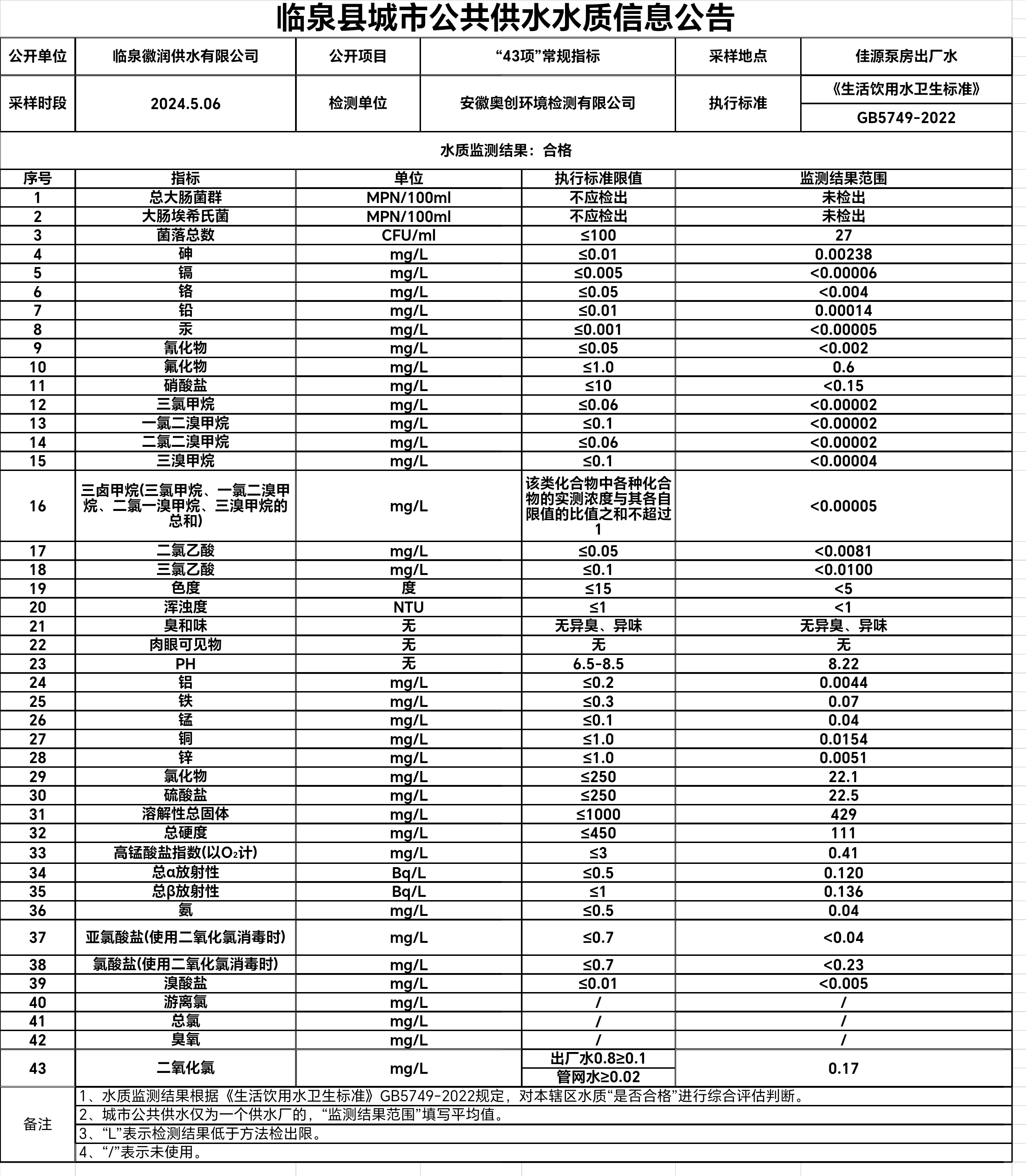 上一条: 临泉县城市公共供水水质信息公告2024年5月20日至2024年5月26日(9项)