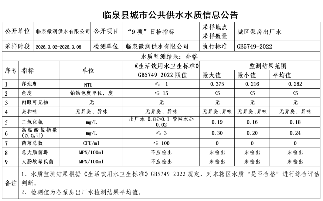 上一条: 临泉县城市公共供水水质信息公告2026年3月(43项)
