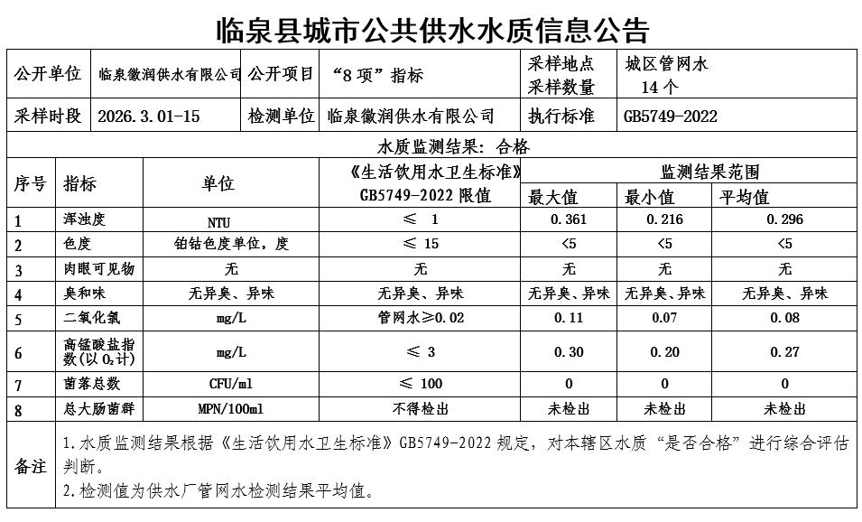 下一条: 临泉县城市公共供水水质信息公告2026年3月9日至2026年3月15日(9项)