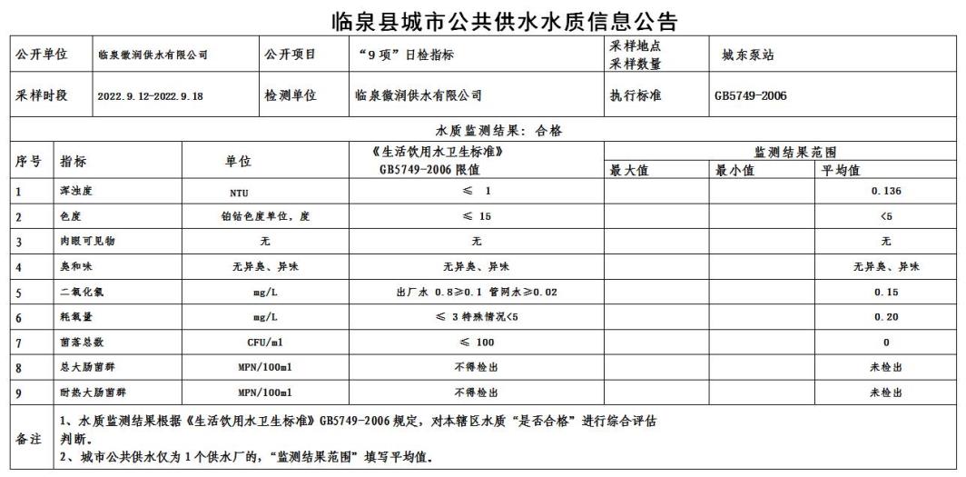 下一条: 2022年9月5日至2022年9月11日临泉县城市公共供水水质信息公告(9项)