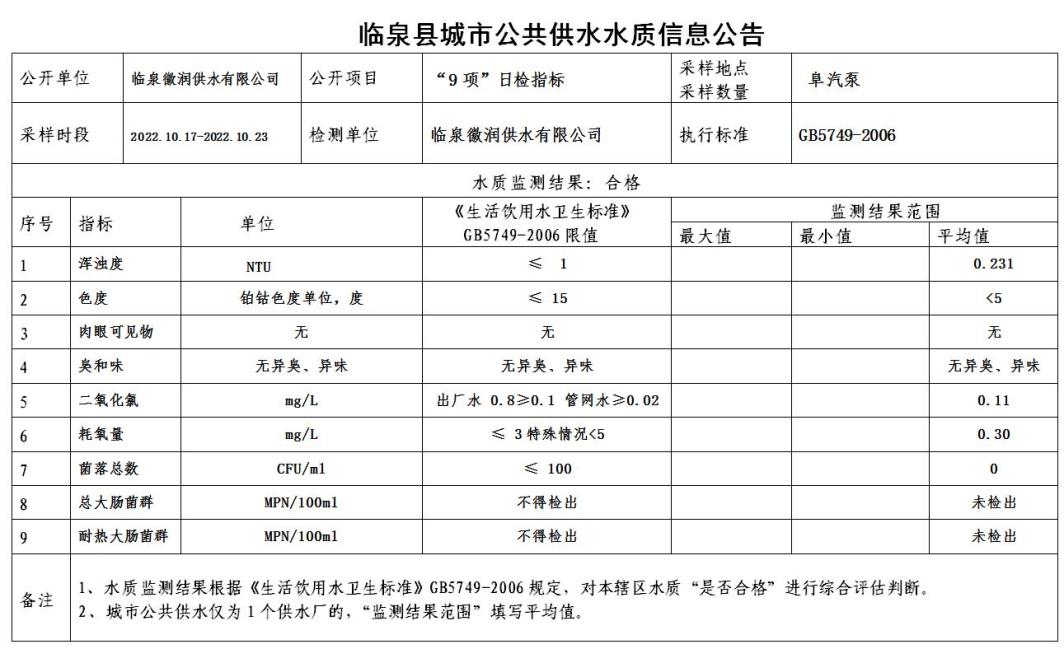上一条: 2022年10月24日至2022年10月30日临泉县城市公共供水水质信息公告(9项)