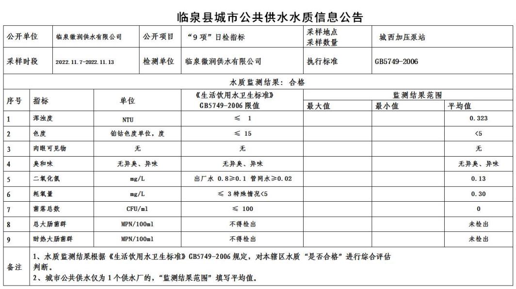 下一条: 2022年10月31日至2022年11月6日临泉县城市公共供水水质信息公告(9项)