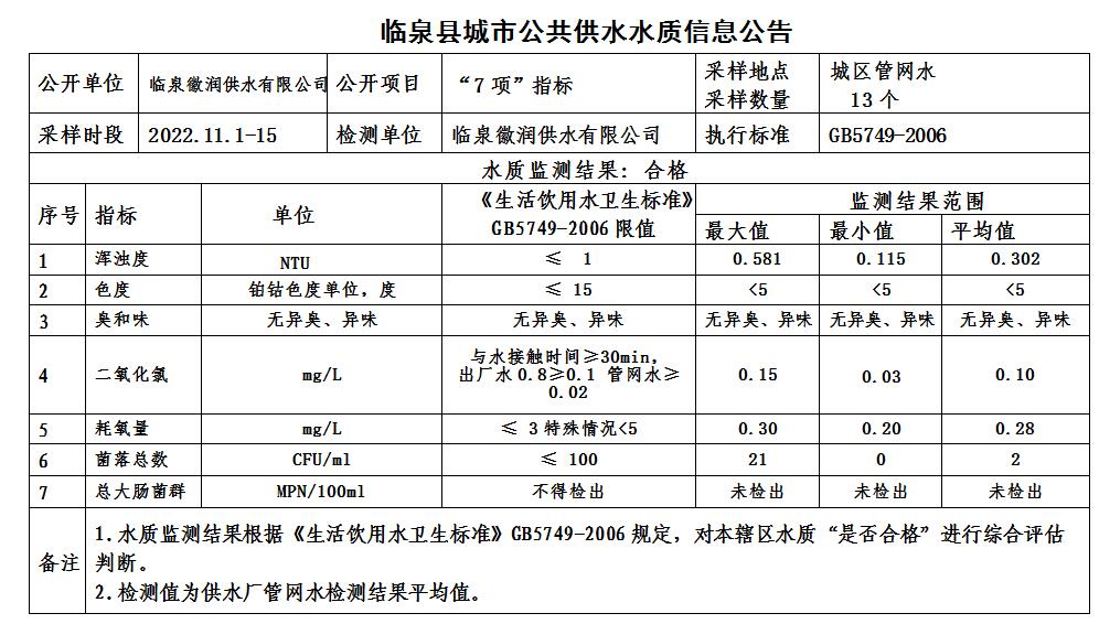 下一条: 2022年11月7日至2022年11月13日临泉县城市公共供水水质信息公告(9项)