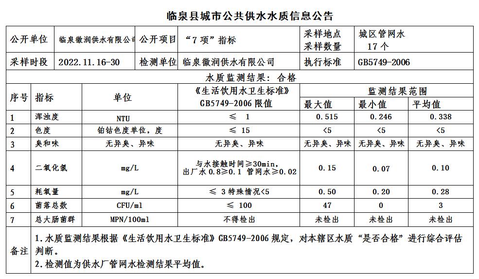 下一条: 2022年11月21日至2022年11月27日临泉县城市公共供水水质信息公告(9项)
