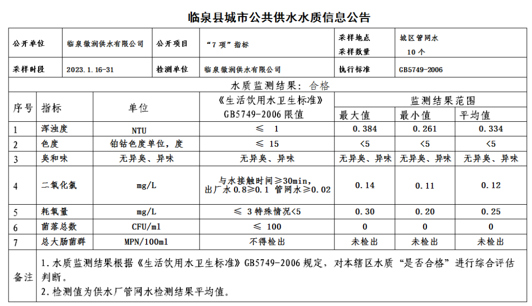 下一条: 2023年1月23日至2023年1月29日临泉县城市公共供水水质信息公告(9项)