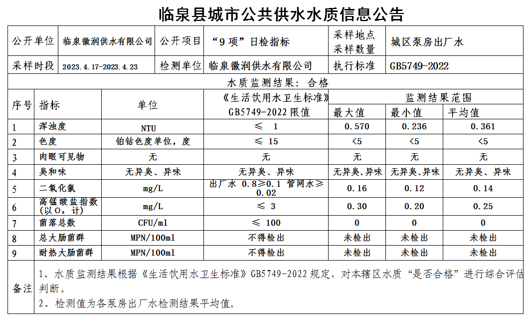 下一条: 临泉县城市公共供水水质信息公告2023年4月上半月(7项)