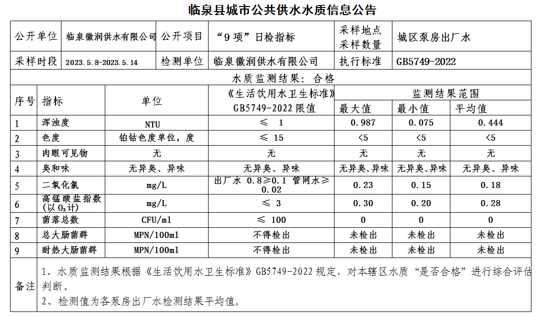 上一条: 临泉县城市公共供水水质信息公告2023年5月上半月(7项)