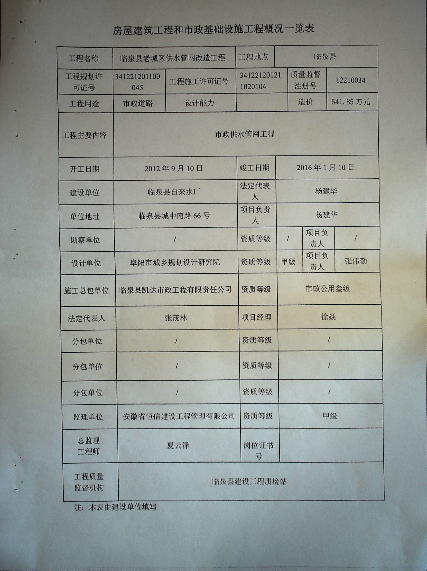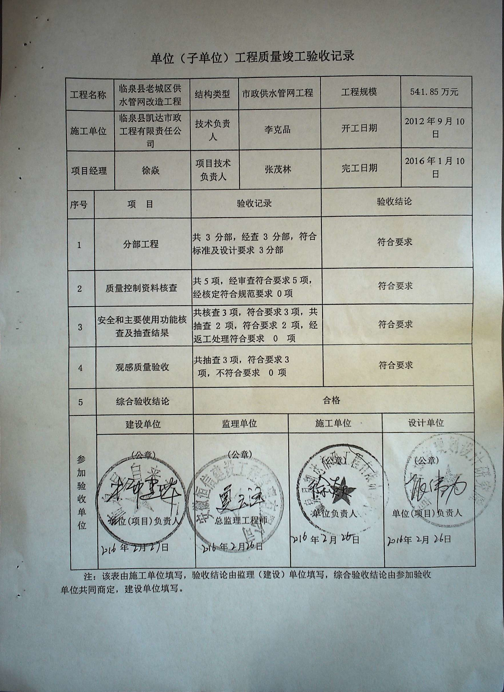 临泉县老城区供水管网改造工程于2016年2月26日顺利通过专家组竣工验收。
